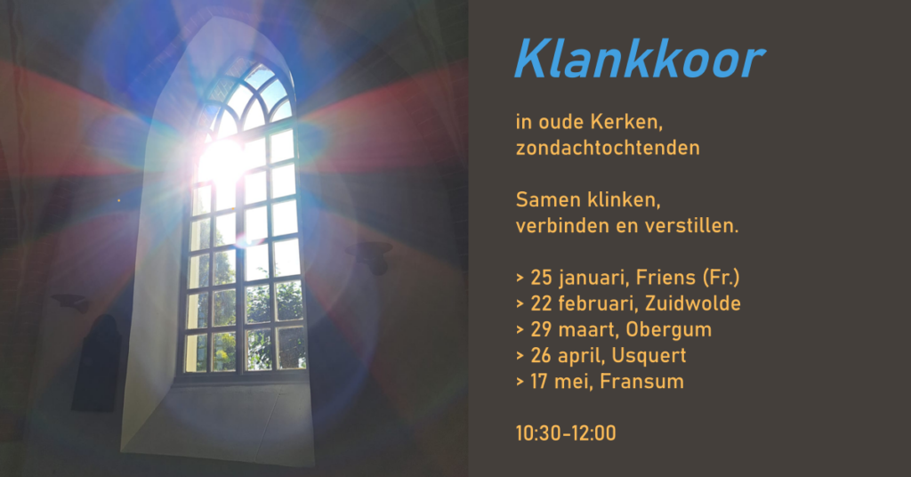 Samen klinken is elkaar ontmoeten, is luisteren naar elkaar, is gehoord worden. Ruimte geven aan wat er speelt, maar ook plezier maken en je laten verrassen. Klanken van verbinding! En waar kan dat beter dan in de oeroude (Groninger) kerken, de bakens van steun en samenkomst door de eeuwen heen.